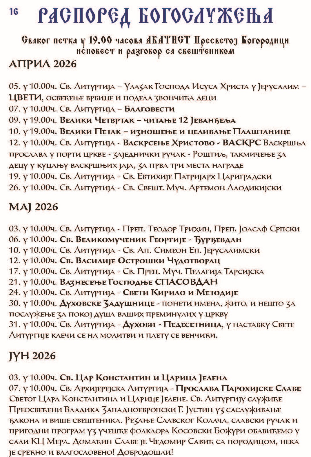 Распоред Богослужења 1 васкрс 26